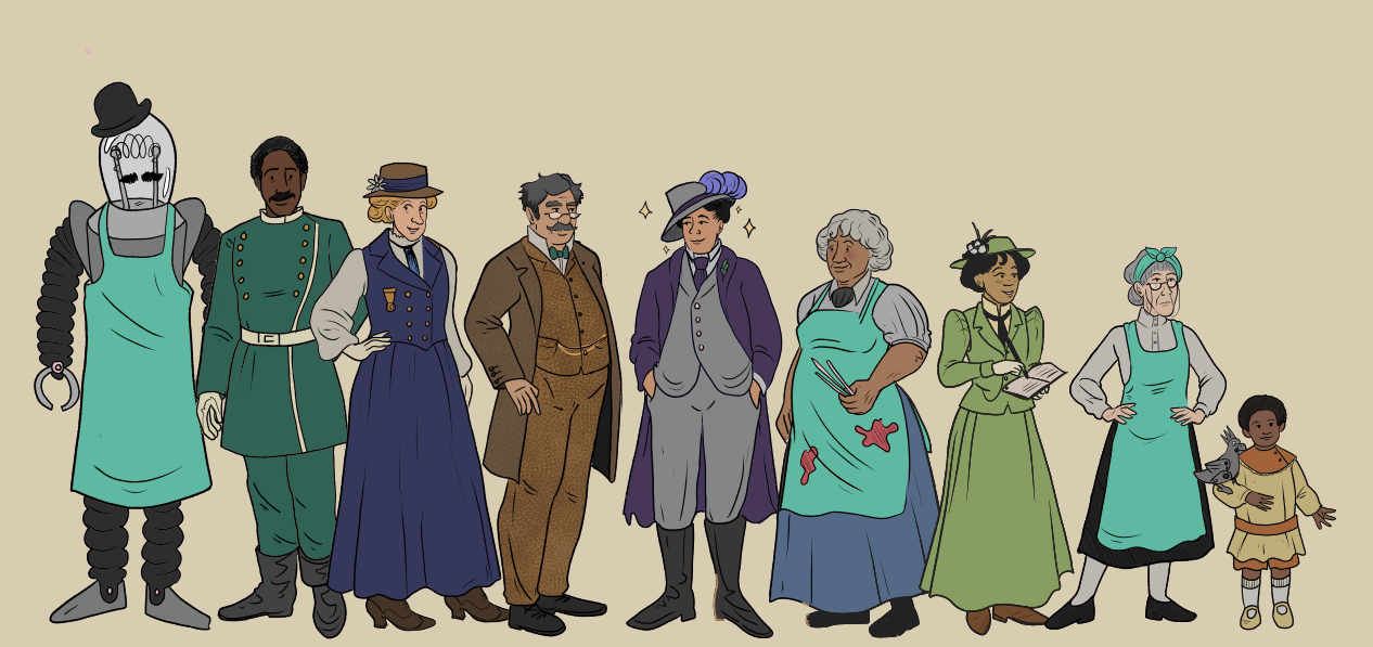 Illustrations of a collection of eccentric Edwardian characters (with a slight sci-fi twist) in height order.